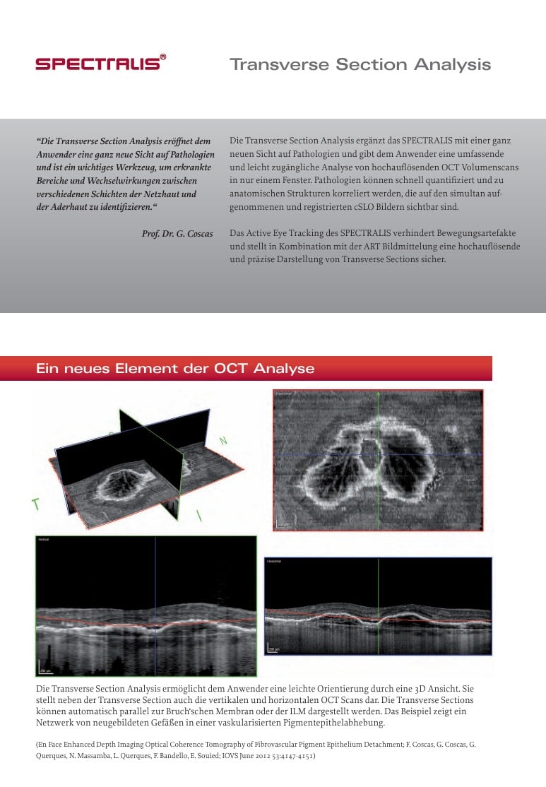 Die Transverse Section Analysis ergänzt das SPECTRALIS mit einer ganz neuen Sicht auf Pathologien und gibt dem Anwender eine umfassende und leicht zugängliche Analyse von hochauflösenden OCT Volumenscans in nur einem Fenster.