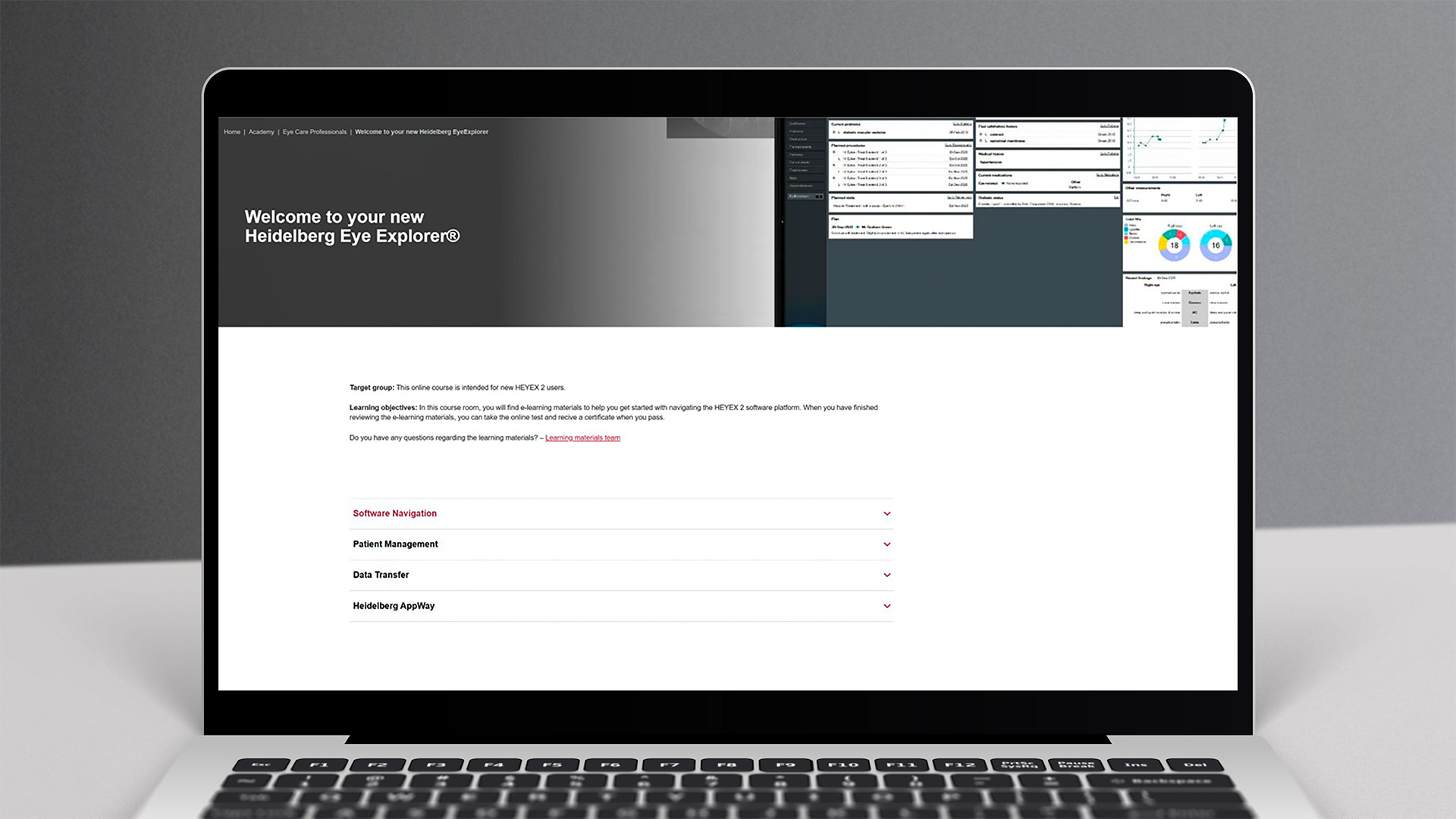 Learning objectives: In this course room, you will find e-learning materials to help you get started with navigating the HEYEX 2 software platform. When you have finished reviewing the e-learning materials, you can take the online test and recive a certificate when you pass.