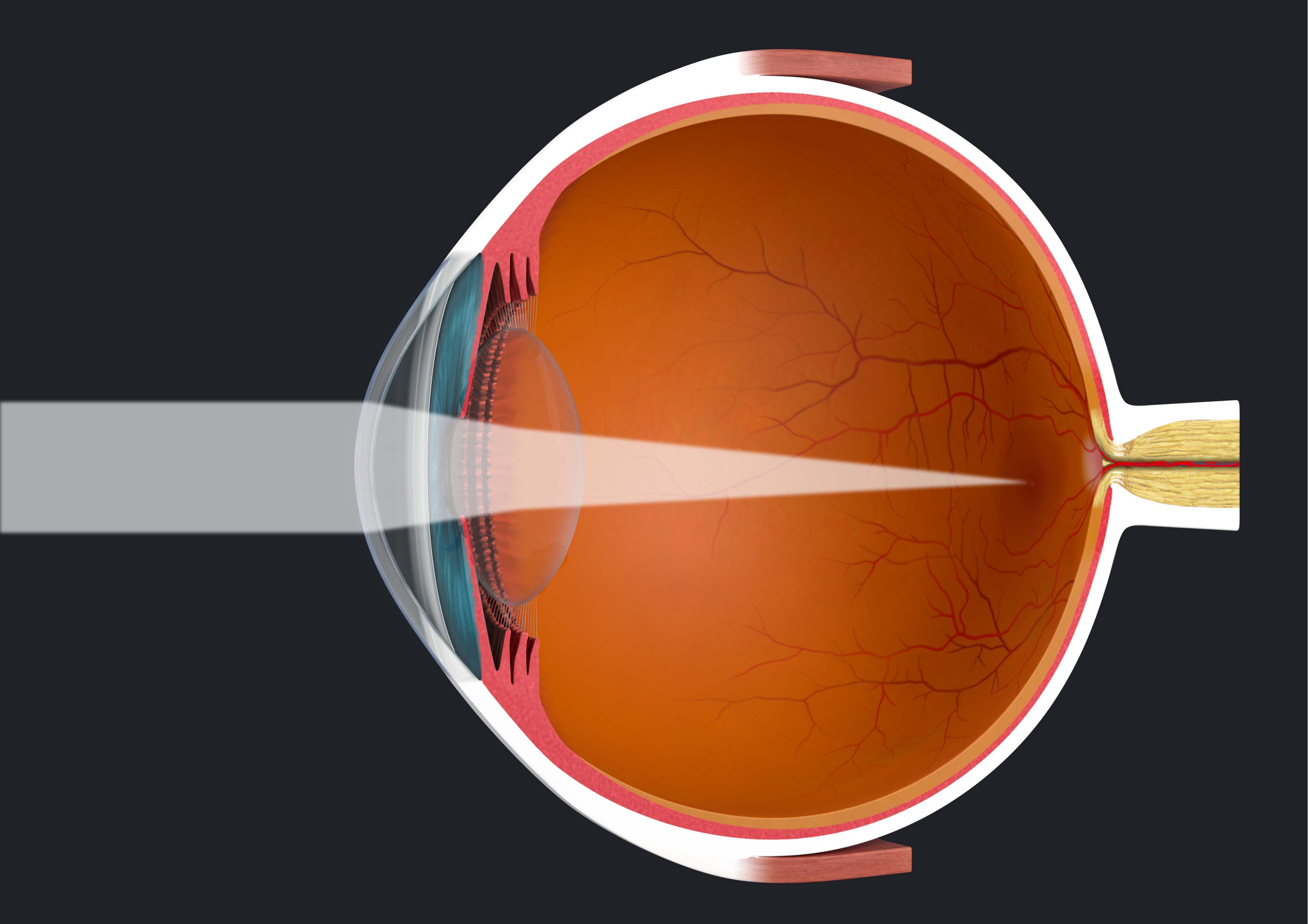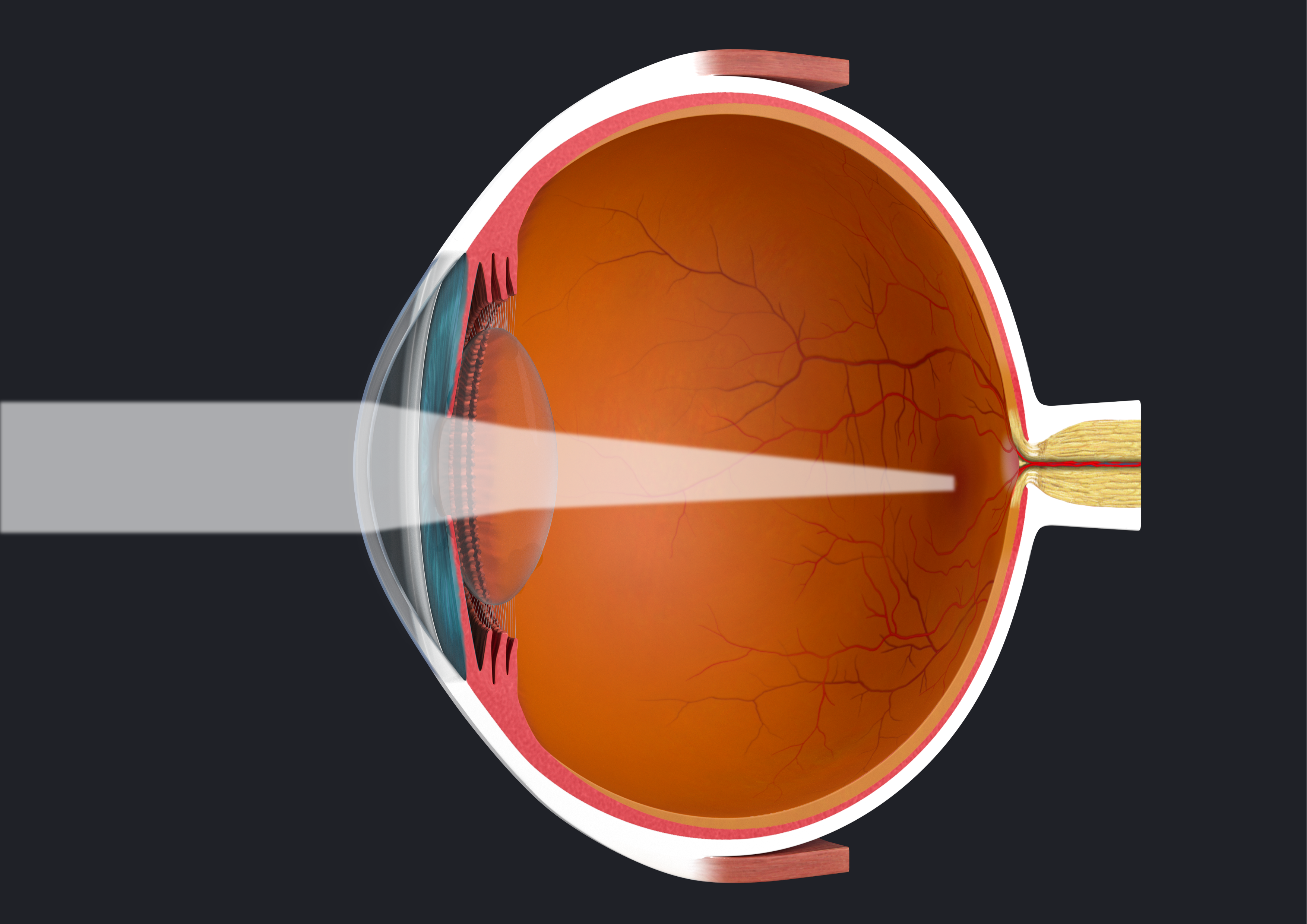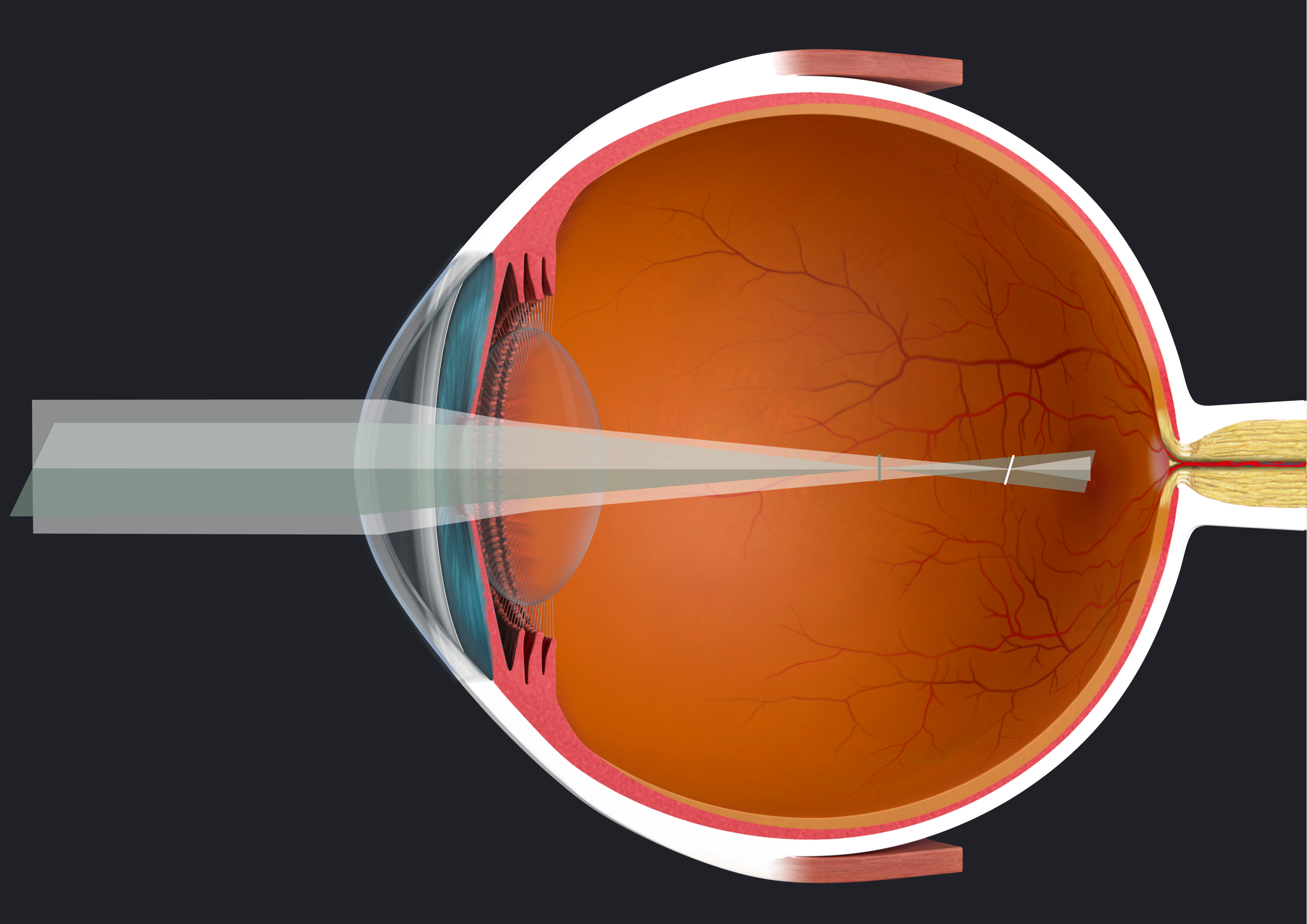 Emmetropia describes the condition in which no refractive error is present. In order to see clearly, the focal point of the incoming light must fall precisely on the retina. Ideally, the incoming light rays are bent by the cornea and the crystalline lens of the eye in such a way that they meet exactly on the fovea and produce a sharp image.
