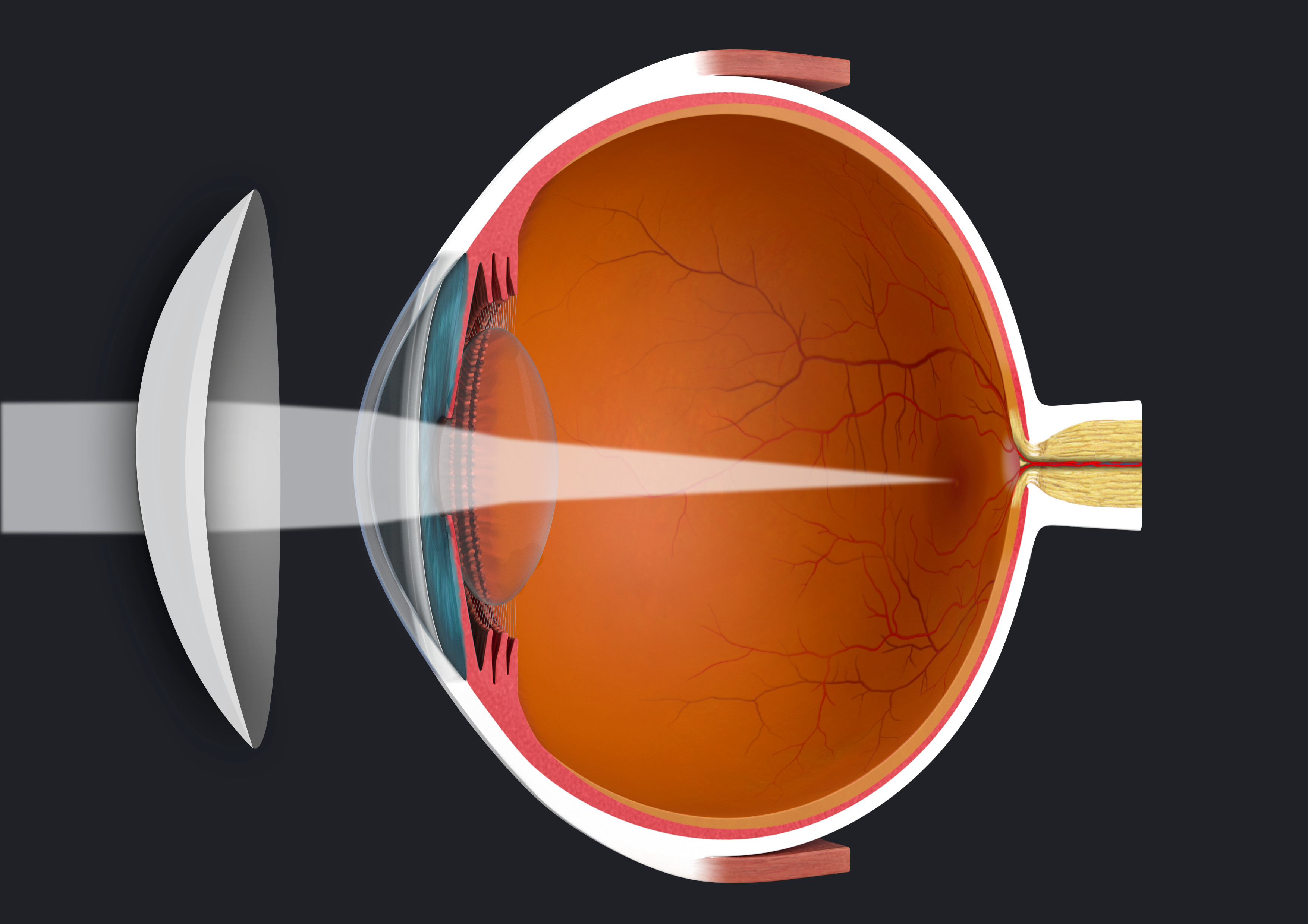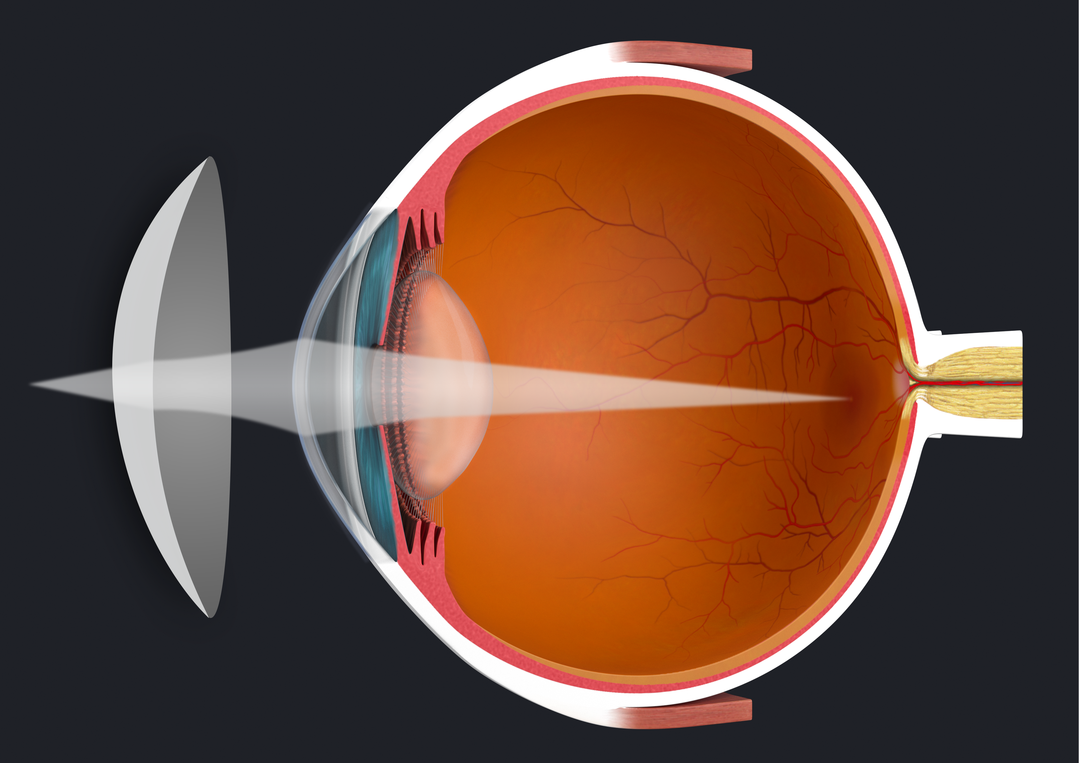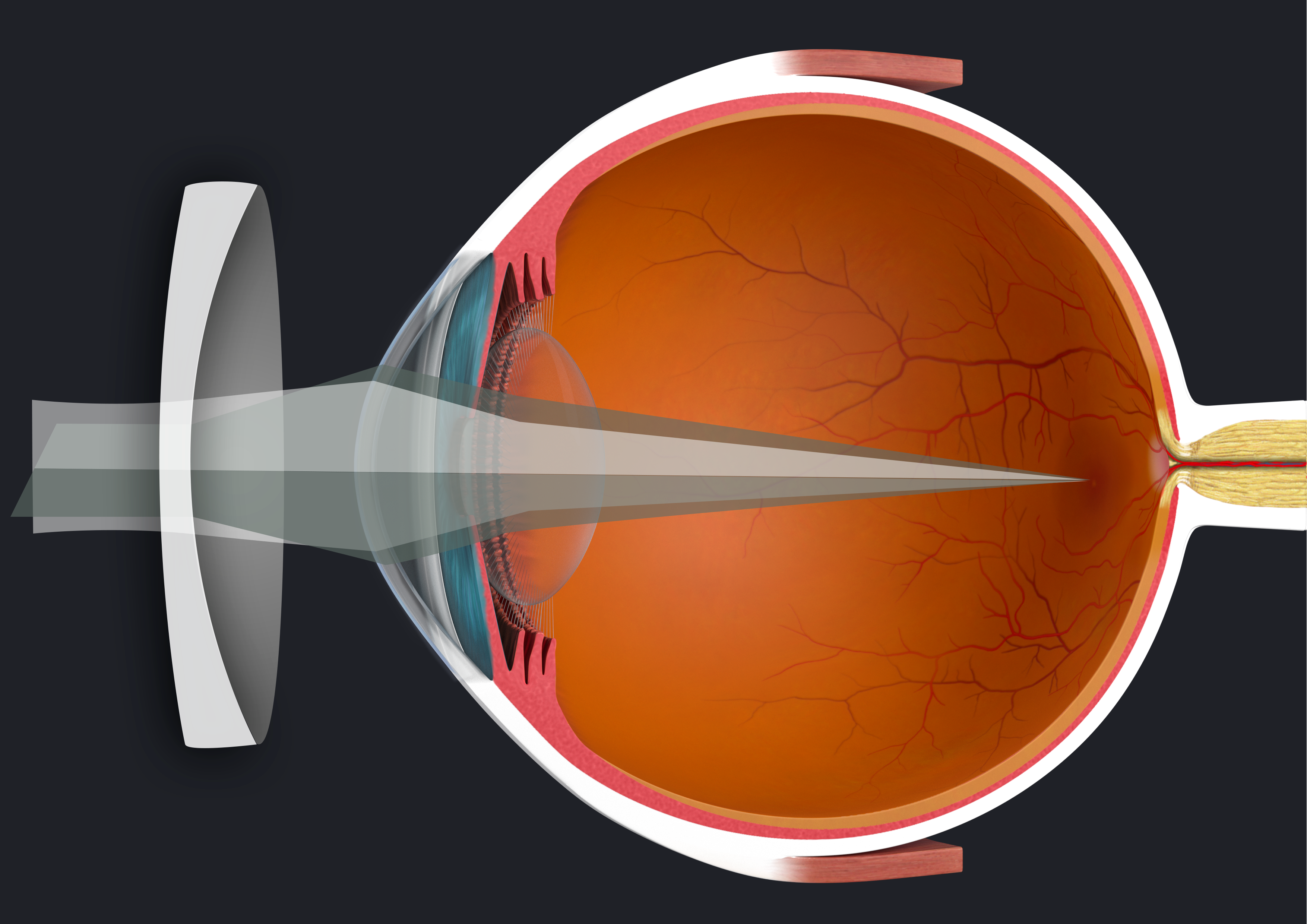 Emmetropia describes the condition in which no refractive error is present. In order to see clearly, the focal point of the incoming light must fall precisely on the retina. Ideally, the incoming light rays are bent by the cornea and the crystalline lens of the eye in such a way that they meet exactly on the fovea and produce a sharp image.