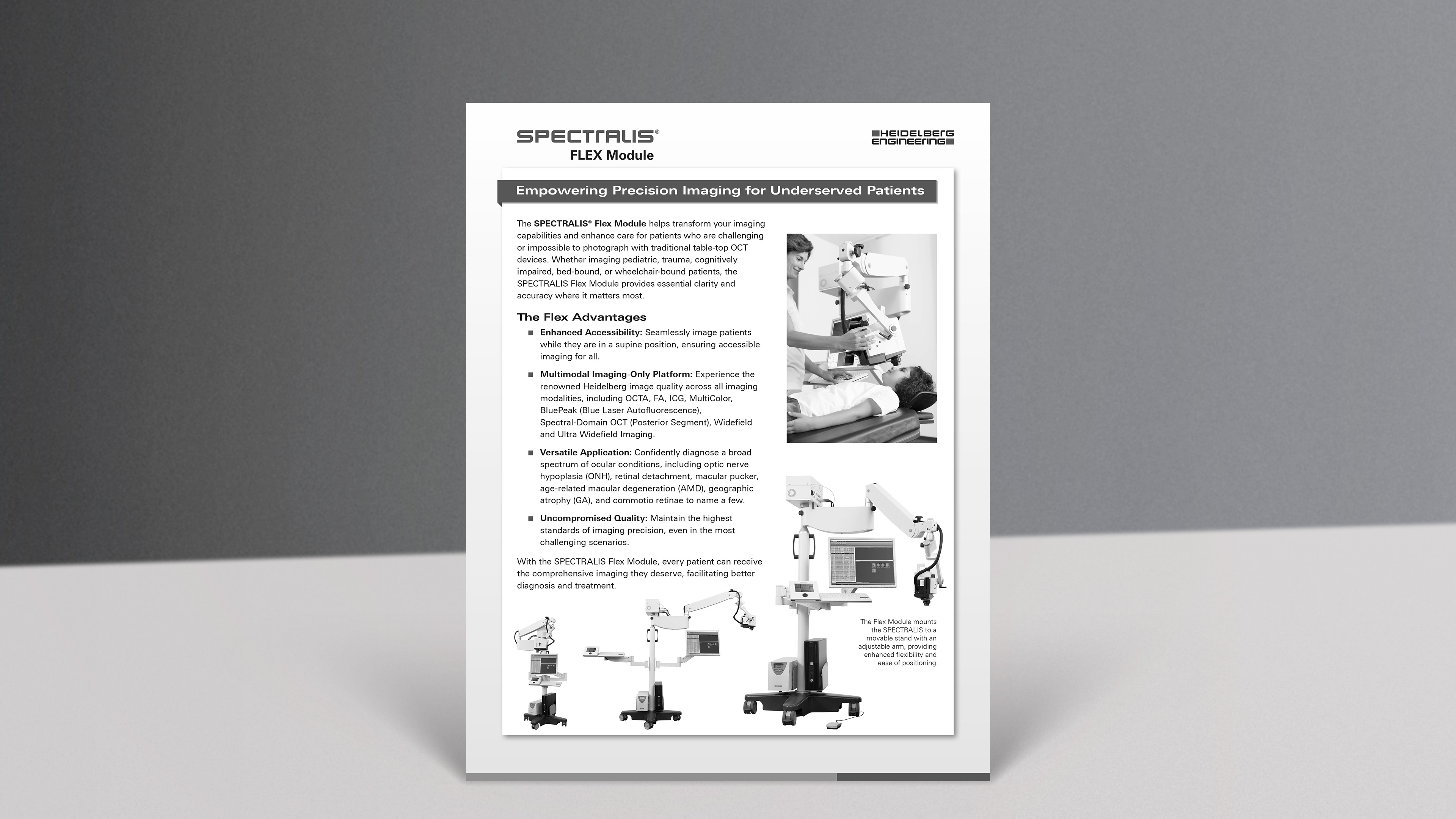 The SPECTRALIS Flex Module helps transform your imaging capabilities and enhance care for patients who are challenging or impossible to photograph with traditional table-top OCT devices.