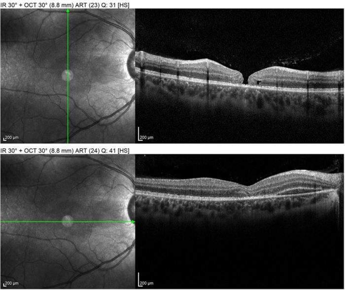 SPECTRALIS OCT shows Macular hole, subretinal hemorrhage, loss of photoreceptor layer.