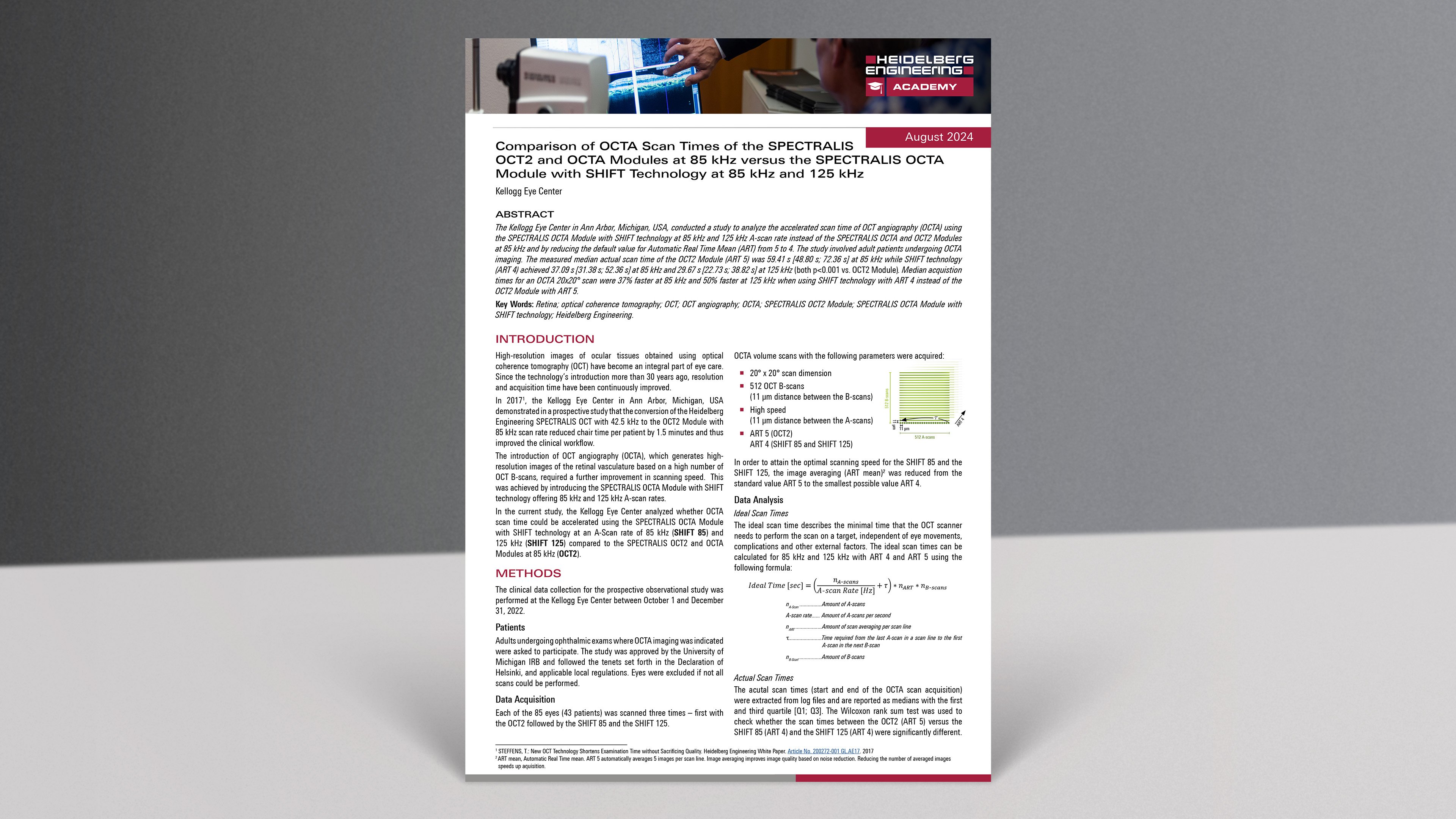 In this study, the Kellogg Eye Center analyzed whether OCTA scan time could be accelerated using the SPECTRALIS OCTA Module with SHIFT technology at an A-Scan rate of 85 kHz and 125 kHz compared to the SPECTRALIS OCT2 and OCTA Modules at 85 kHz.