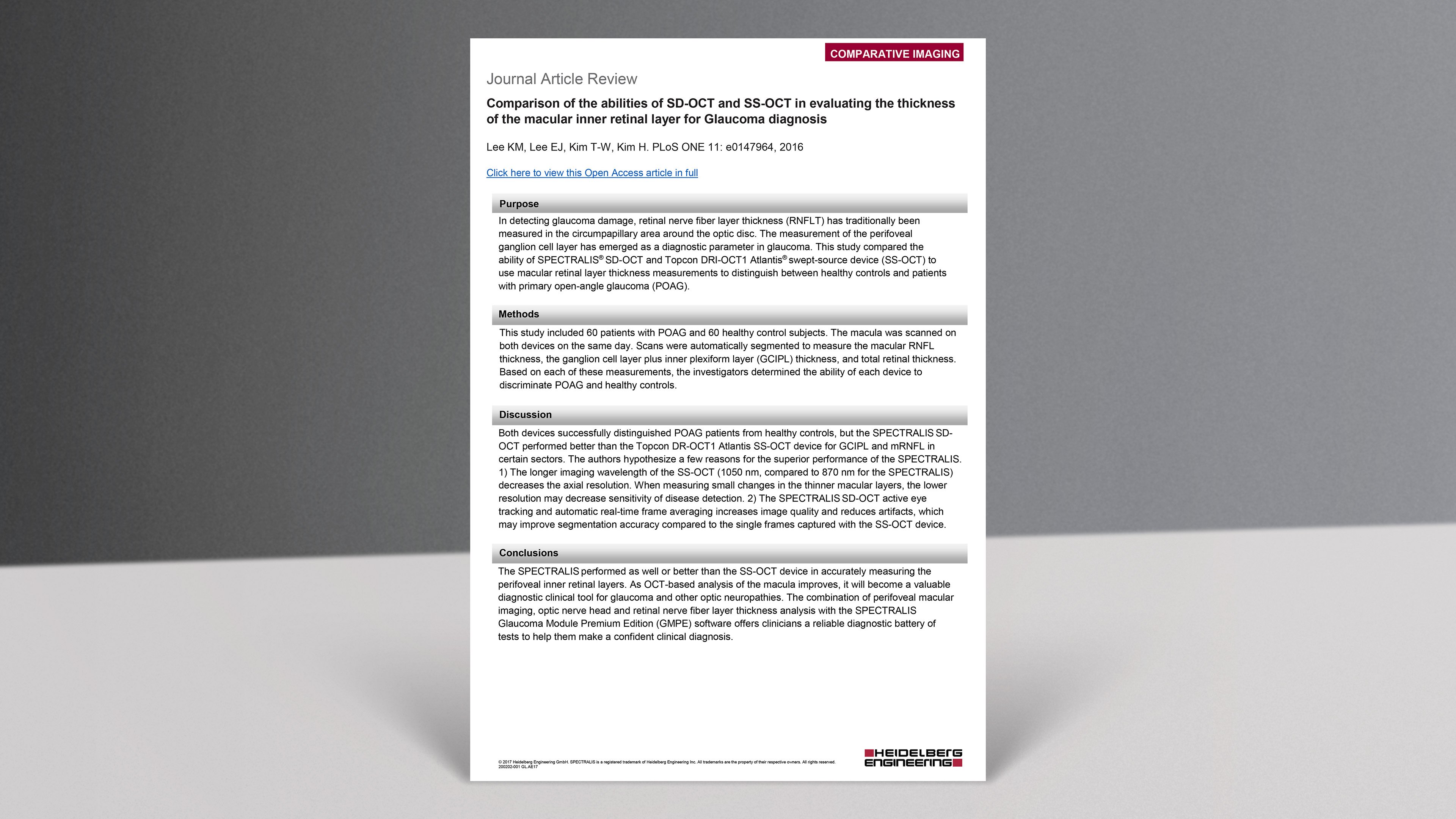 This study compared the ability of SPECTRALIS SD-OCT and Topcon DRI-OCT1 Atlantis swept- source device to use macular retinal layer thickness measurements to distinguish between healthy controls and patients with primary open-angle glaucoma.