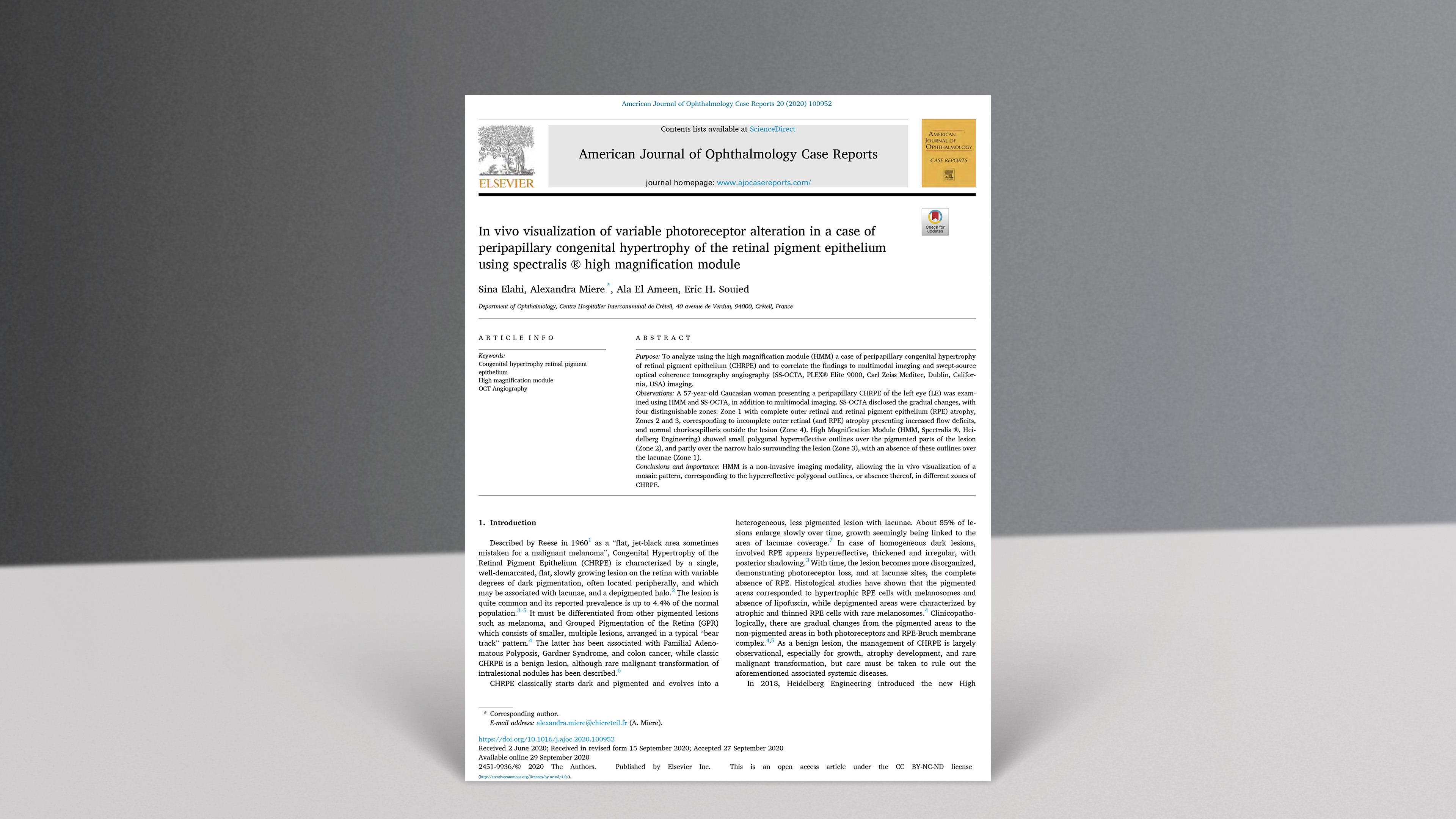 HMM ist eine nicht-invasive Bildgebungsmodalität, die die In-vivo-Visualisierung eines Mosaikmusters ermöglicht, das den hyperreflektiven polygonalen Umrissen bzw. deren Fehlen in verschiedenen Zonen der CHRPE entspricht.
